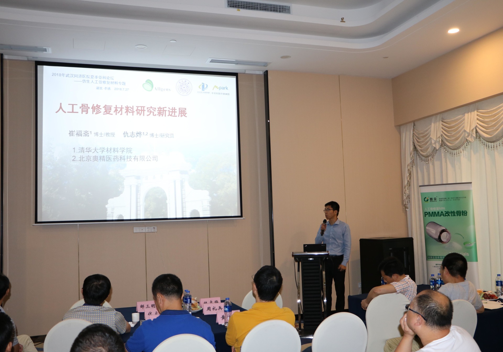 清华大学研究员、奥精医药科技有限公司副总经理仇志烨博士针对《人工骨修复材料研究新进展》进行了专题报告,对目前骨修复材料的发展趋势及我公司产品的技术优势做了详细讲解,从材料学的角度详细讲解了各种品规产品的适应症和特点,并向与会专家系统介绍了仿生矿化胶原”骼金“人工骨修复材料在脊柱、关节、创伤、骨肿瘤等各类骨缺损中的临床应用。